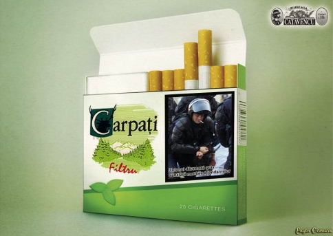 În curând, pe pachetele de țigarete, împreună cu fotografia jandarmului care bate un suporter al echipei Universitatea Craiova, vom citi și următoarele mesaje:
