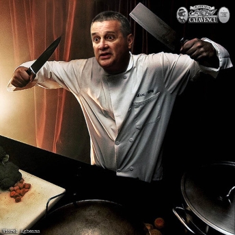 Vecinii poetului Mircea Dinescu au depus mai multe plângeri la poliție, disperați de faptul că acesta gătește non-stop și devine recalcitrant dacă lumea nu îi soarbe din ochi rețetele boierești. Conform datelor furnizate de polițiști, legea nu poate să îl atingă pe Dinescu, el fiind un revoluționar al liberei exprimări și gătiri la orice oră, indiferent de religie, sex ori culoare politică. Au apărut și glumițe la adresa poetului gastronimic: „Dinescu gătește atât de mult și des, că până și somalezii ar spune «gata, ne-am săturat!»” și „Când nu gătește Dinescu? Când și când”.