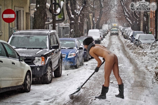 Pentru a reduce costurile operaţiunii de deszăpezire a arterelor bucureştene afectate de ninsori, primarul general al Capitalei, Sorin Oprescu, a scos în stradă în această dimineaţă un contingent consistent de asistente personale, recrutate îndeosebi din cluburile Bamboo, Princess şi de pe străzile Magheru, Vasile Lascăr colţ cu Maria Rosetti şi Mătăsari. Miza edilului Capitalei este puterea exemplului, anume faptul că, impresionaţi de apariţia la stradă a fetelor echipate doar în fulare, fesuri şi mănuşi, bucureştenii se vor îmbulzi să le dea o mână de ajutor, care cu lopeţi, care cu făraşe, care cu mături, baxuri de sare ori săculeţi cu nisip. În funcţie de ecourile şi răspunsul la nivel de masă pe care l-ar putea avea operaţiunea, Oprescu ar putea chiar să ceară primarilor de sector rezilierea, pe viitor, a unei părţi dintre contractele de salubrizare şi introducerea unor echipe de angajate sexy, care, la orele serii, să măture şi să spele bulevardele bucureştene.