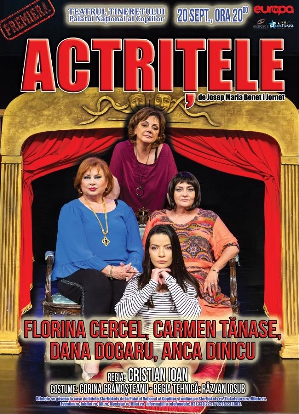 Repertoriul teatral de la Palatul Național al Copiilor se îmbogățește din această toamnă cu spectacolul "Actrițele" a cărei premieră absolută este programată pe 20 septembrie! Secretele vieții de dincolo de cortină le vor dezvălui Florina Cercel, Carmen Tănase, Dana Dogaru și Anca Dinicu. Regizată de Cristian Ioan și având la bază lucrarea omonimă a autorului spaniol Josep Maria Benet i Jornet, piesa aduce în prim plan aspecte legate de frumusețea, dar și de instabilitatea profesiei de slujitor al scenei. Tablourile de un comic copleșitor, dar și momentele de introspecție și secvențele de o mare sensibilitate conturează profilul unui nou spectacol de mare succes, într-o distribuție de excepție.