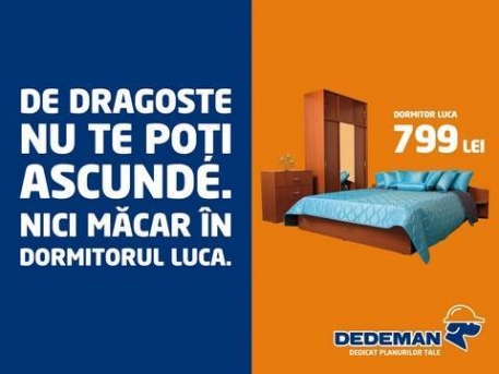 Dar cel mai tare, ca să vedeți cât de diverse sunt căile Domnului, este că același Dedeman s-a gândit chiar și la semnatarul articolului. Sloganul poate fi regăsit în imaginea alăturată și vrea să spună că de dragoste nu puteți scăpa nici măcar în dormitorul meu, darămite în mașină, lift, apartament sau pe unde vă apucă fiorii stârniți de netrebnicul Eros. Vreau să le mulțumesc, sincer, pe această cale, copywriterilor agenției McCann Erickson România, dar și să-i asigur că în dormitorul meu nu sunt decât două pisici. Iar mâncarea pe care le-o ofer este și singurul fel în care le iubesc.