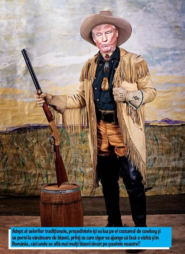 Adept al valorilor tradiționale, președintele își va lua pe el costumul de cowboy și va porni la vânătoare de bizoni, prilej cu care sigur va ajunge să facă o vizită și în România, căci unde se află mai mulți bizoni decât pe șoselele noastre?